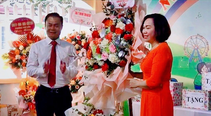 Đồng chí Nguyễn Phong Doanh – Phó Chủ tịch UBND quận tặng hoa chúc mừng tập thể trường Mầm non Hoa Cúc
